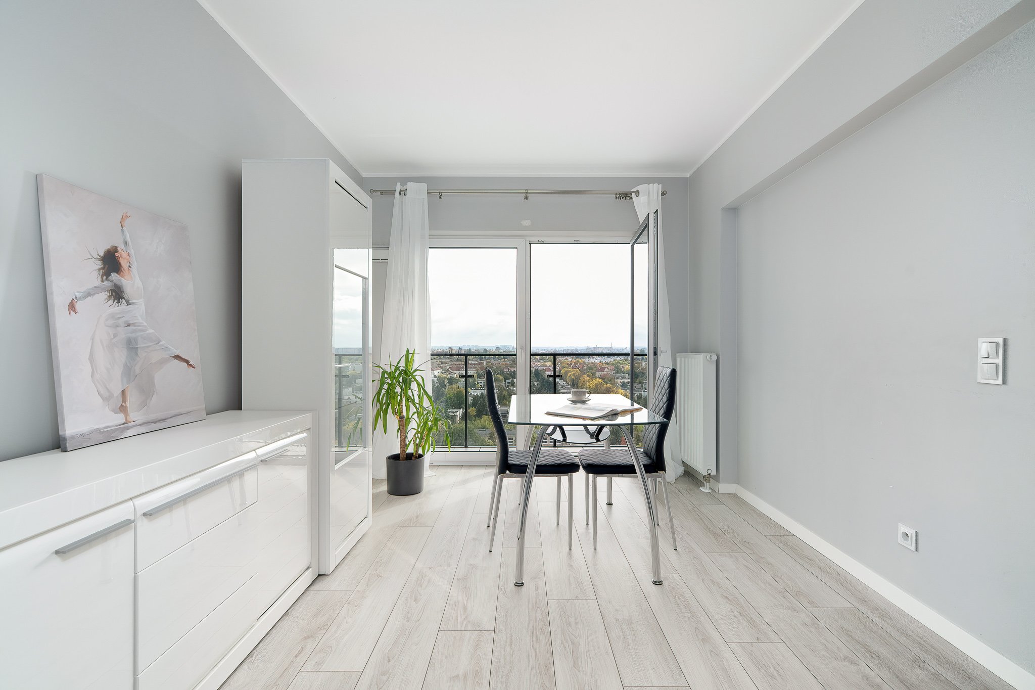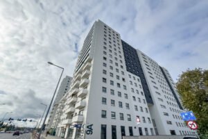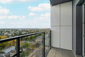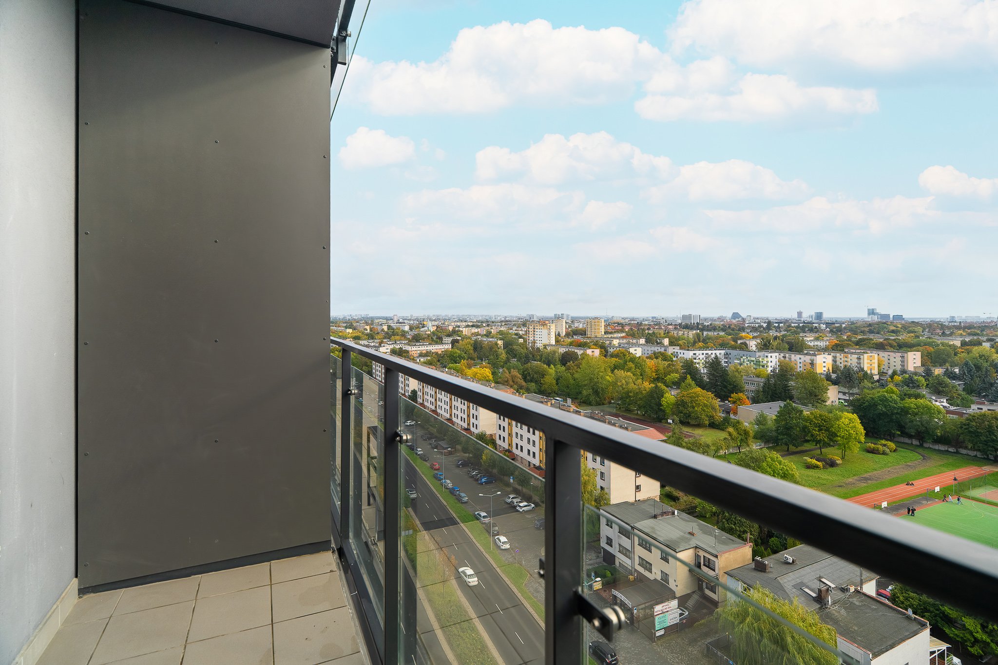 Lokal znajduje się na trzynastym piętrze w piętnastopiętrowym budynku z 2018 roku oraz składa się z przestronnego salonu połączonego z loggią, dużej kuchni i łazienki, wygodnej sypialni oraz ustawnego holu. Kuchnia wyposażona jest w sprzęt AGD: lodówka z zamrażarką, zmywarka, piekarnik, płyta indukcyjna, mikrofalówka oraz okap podłączony do komina wentylacyjnego. W łazience znajduje się wolnostojąca pralka.