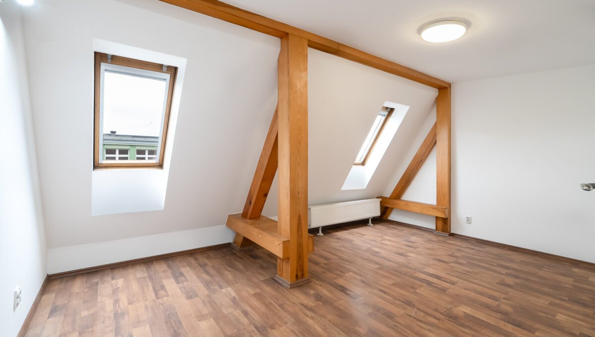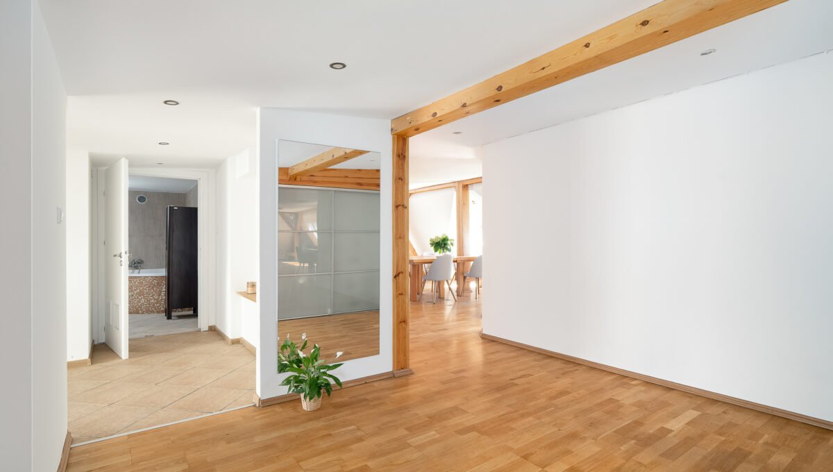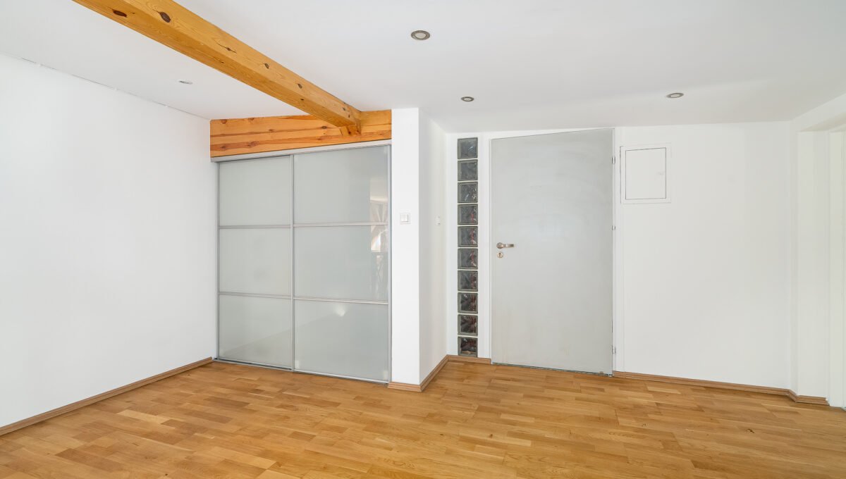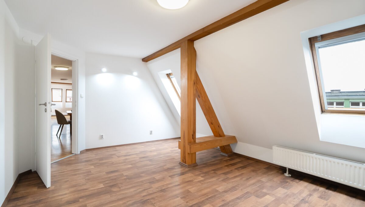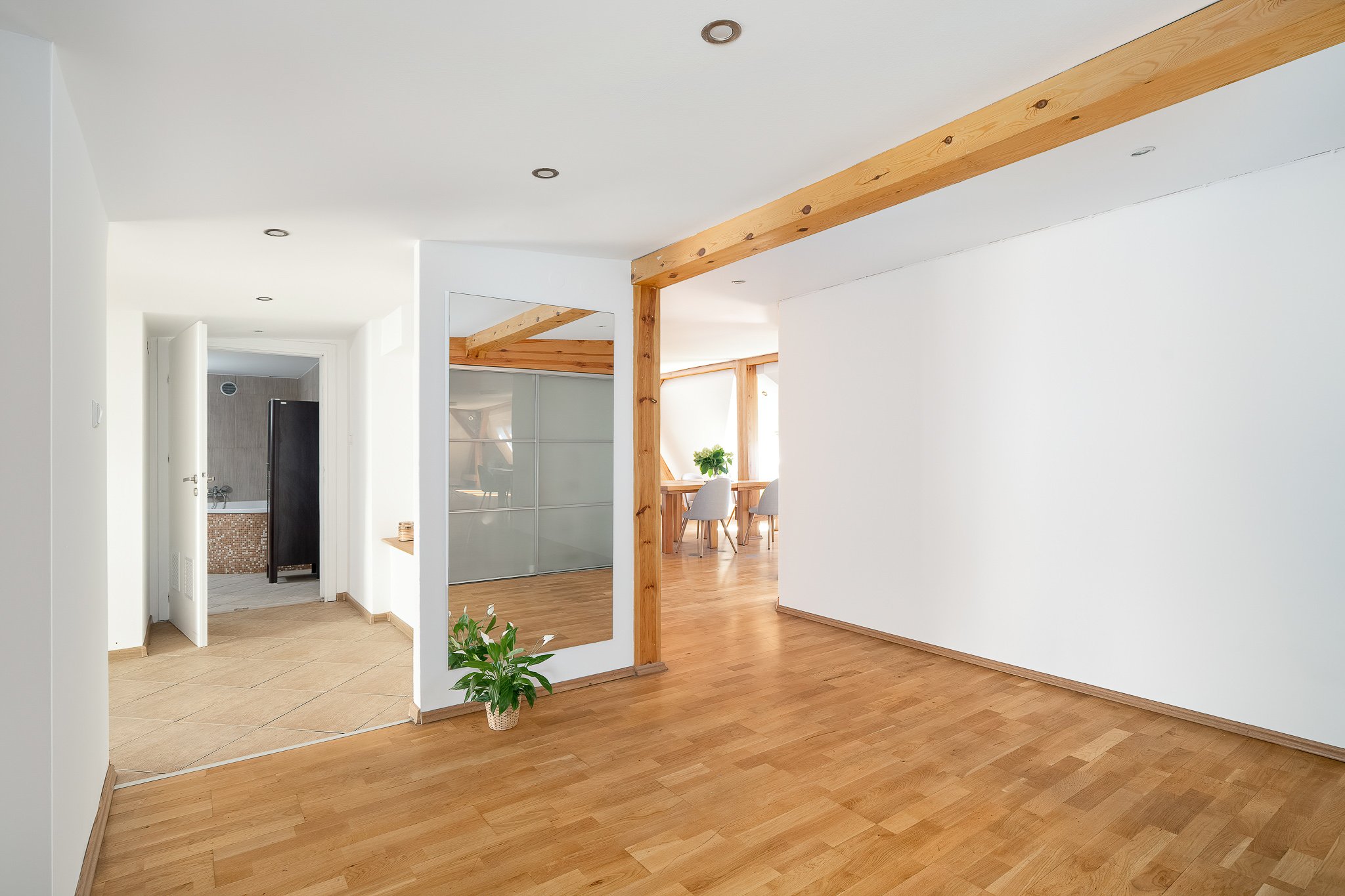 Trzy niezależne pokoje oferują wiele możliwości aranżacyjnych – mogą pełnić funkcję sypialni, pracowni lub pokojów dziecięcych. Każdy z nich posiada swój unikalny układ i urok – niestandardowe linie ścian i sufity dodają im charakteru, a drewniane wykończenia podkreślają spójność stylistyczną całego mieszkania.