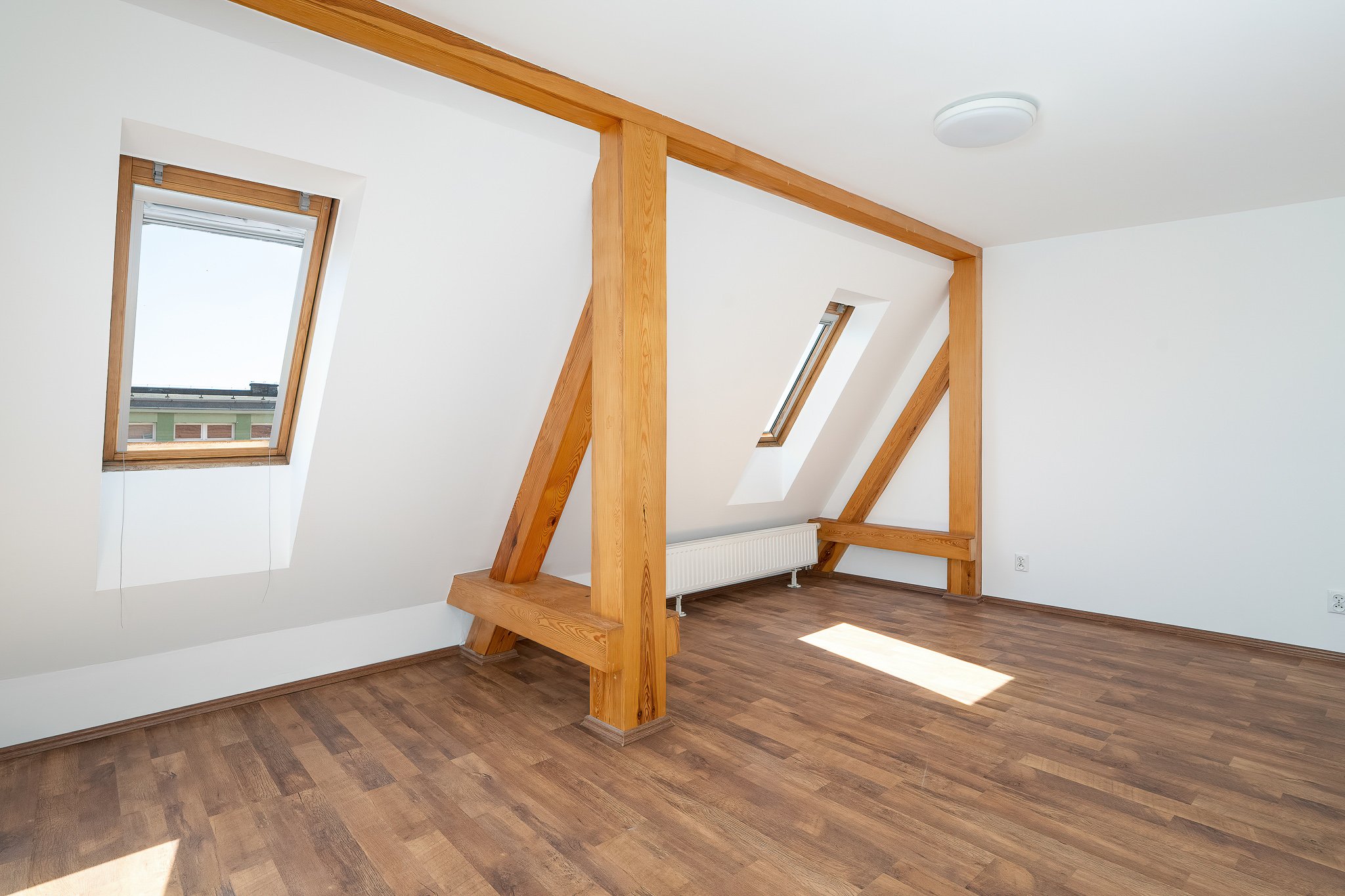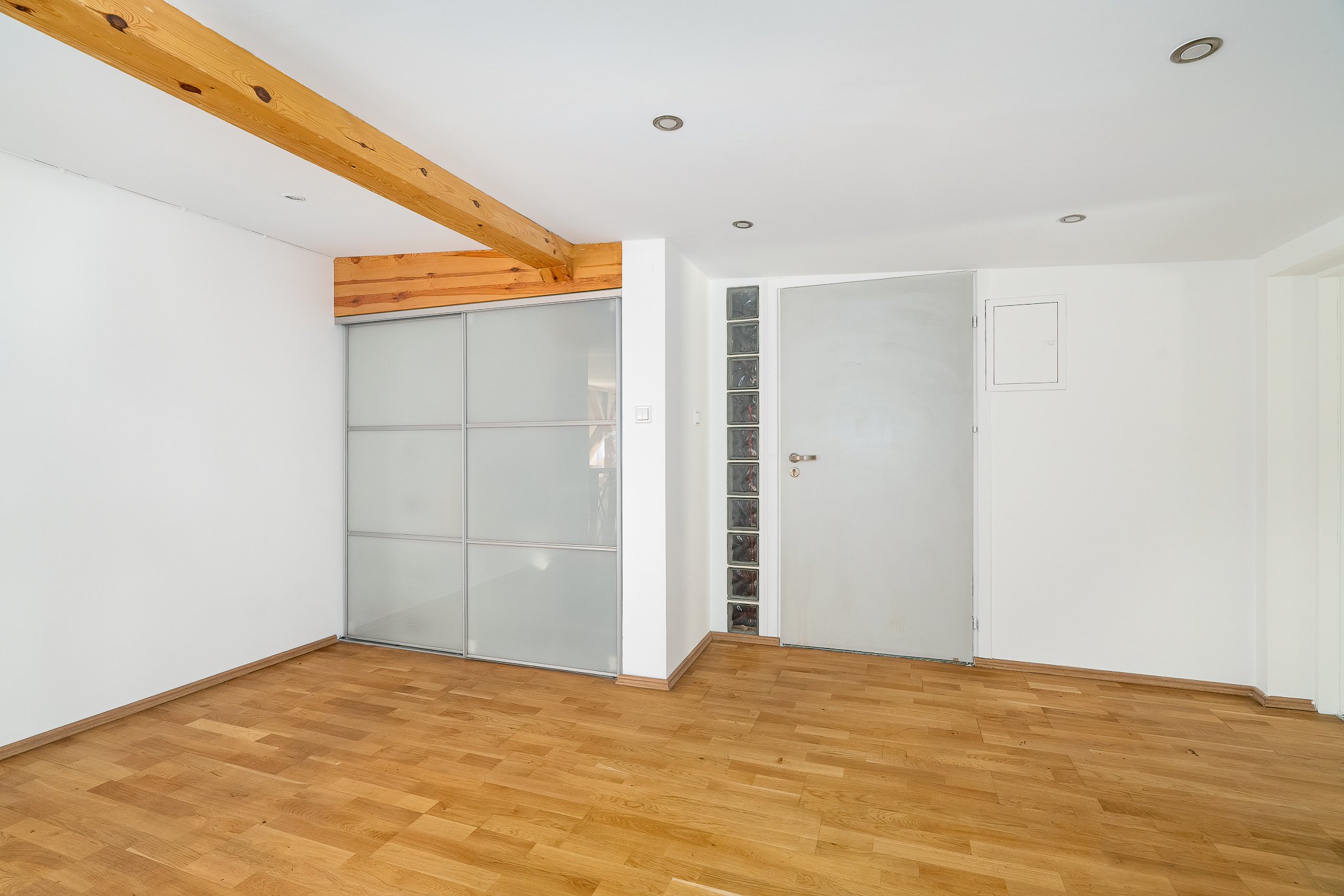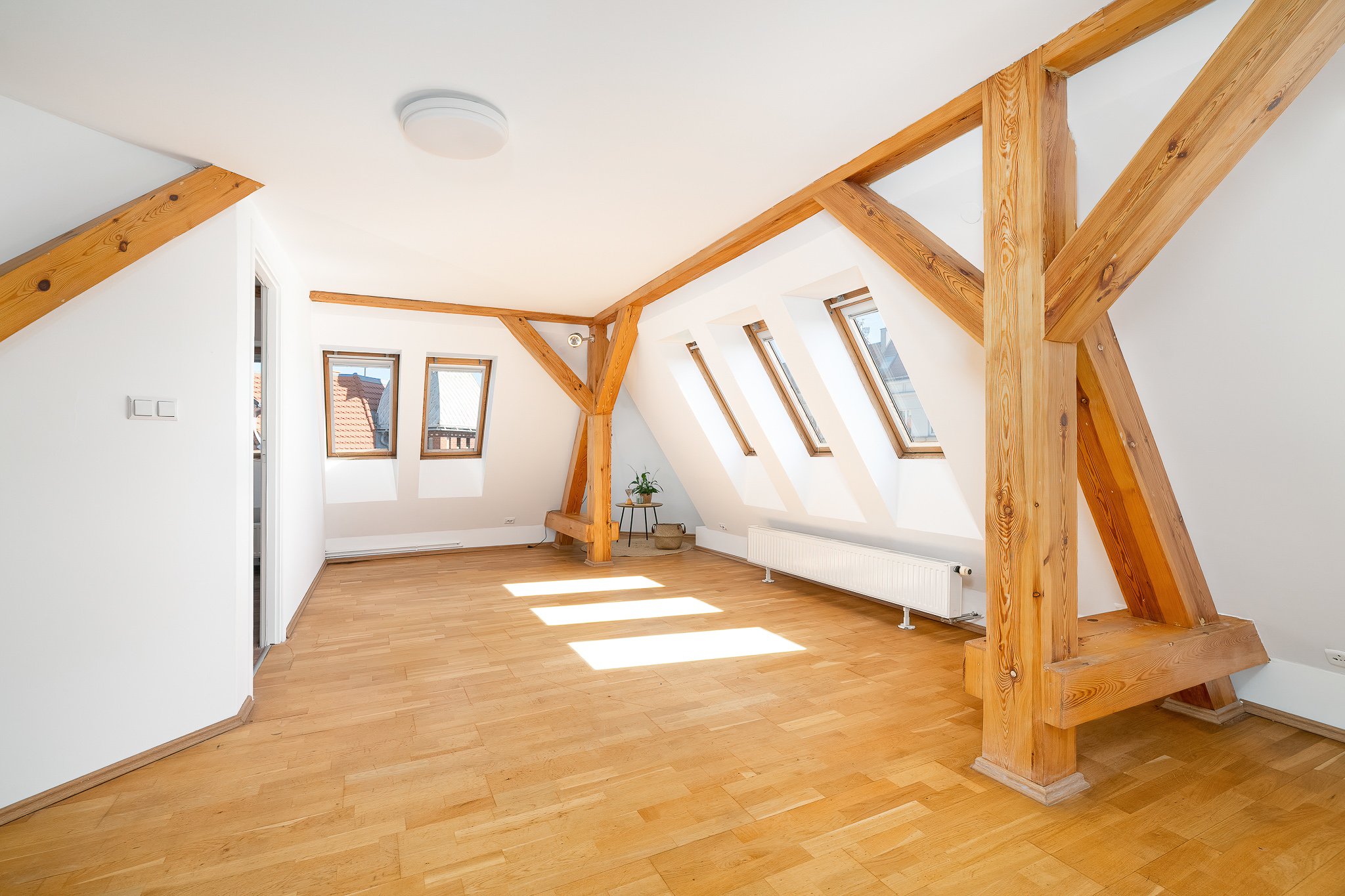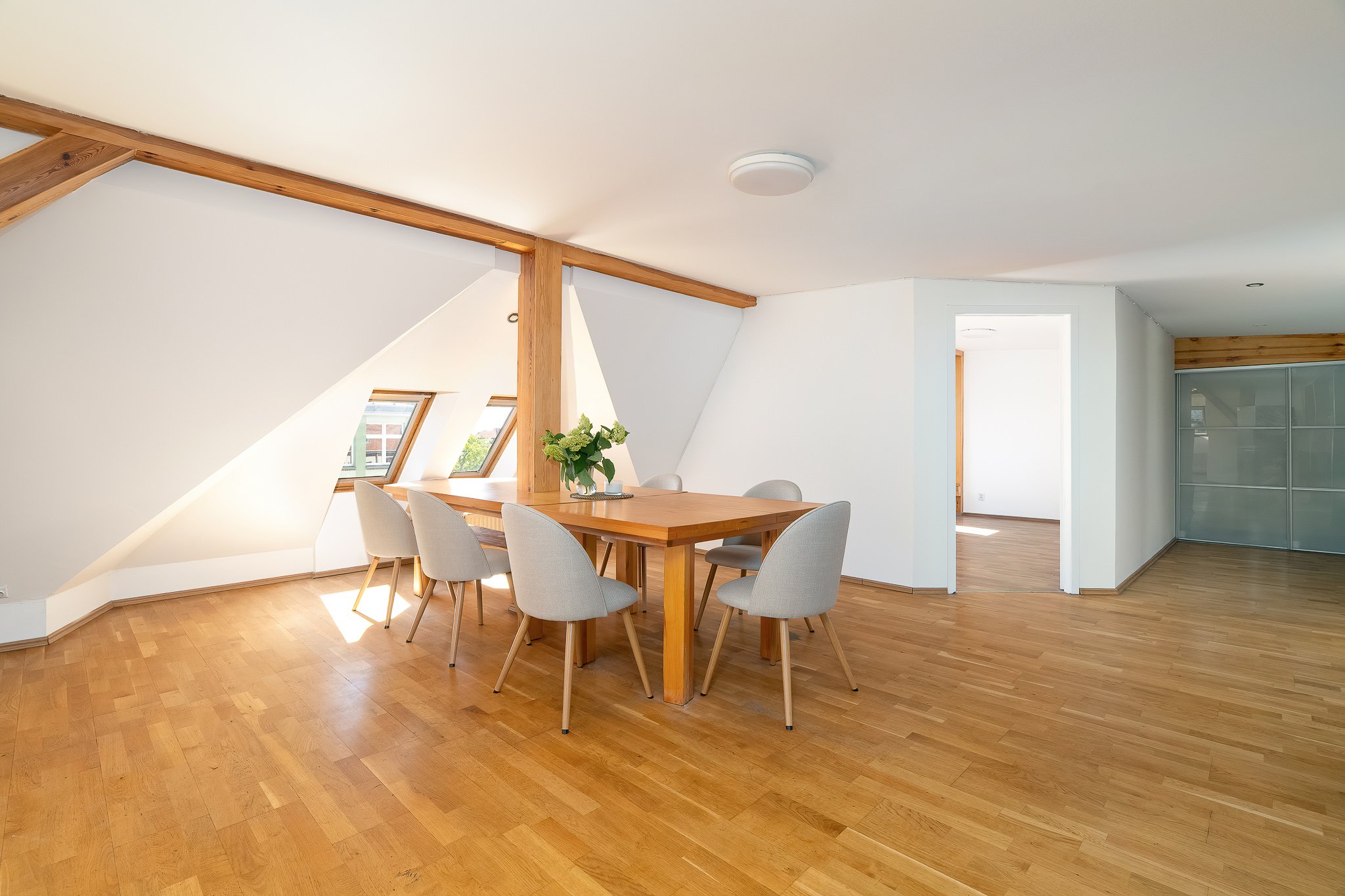 Trzy niezależne pokoje oferują wiele możliwości aranżacyjnych – mogą pełnić funkcję sypialni, pracowni lub pokojów dziecięcych. Każdy z nich posiada swój unikalny układ i urok – niestandardowe linie ścian i sufity dodają im charakteru, a drewniane wykończenia podkreślają spójność stylistyczną całego mieszkania.
