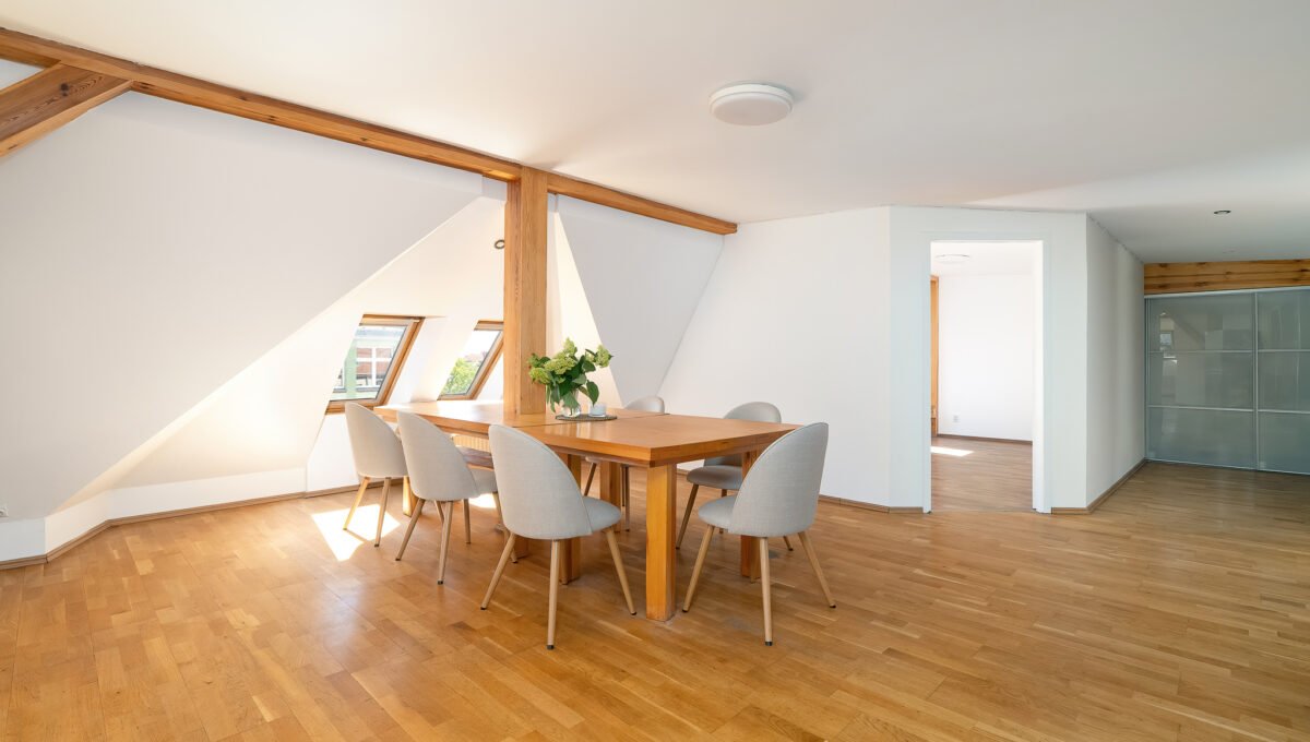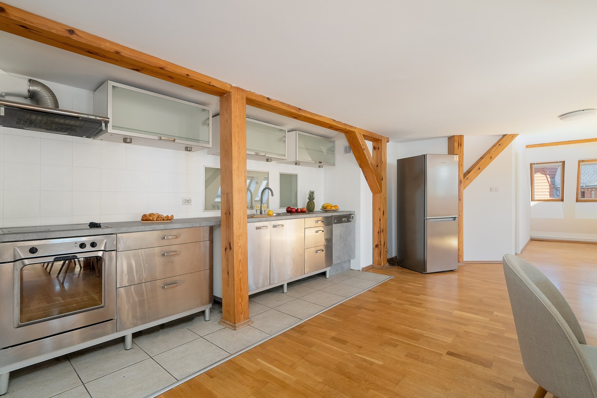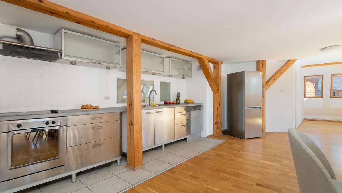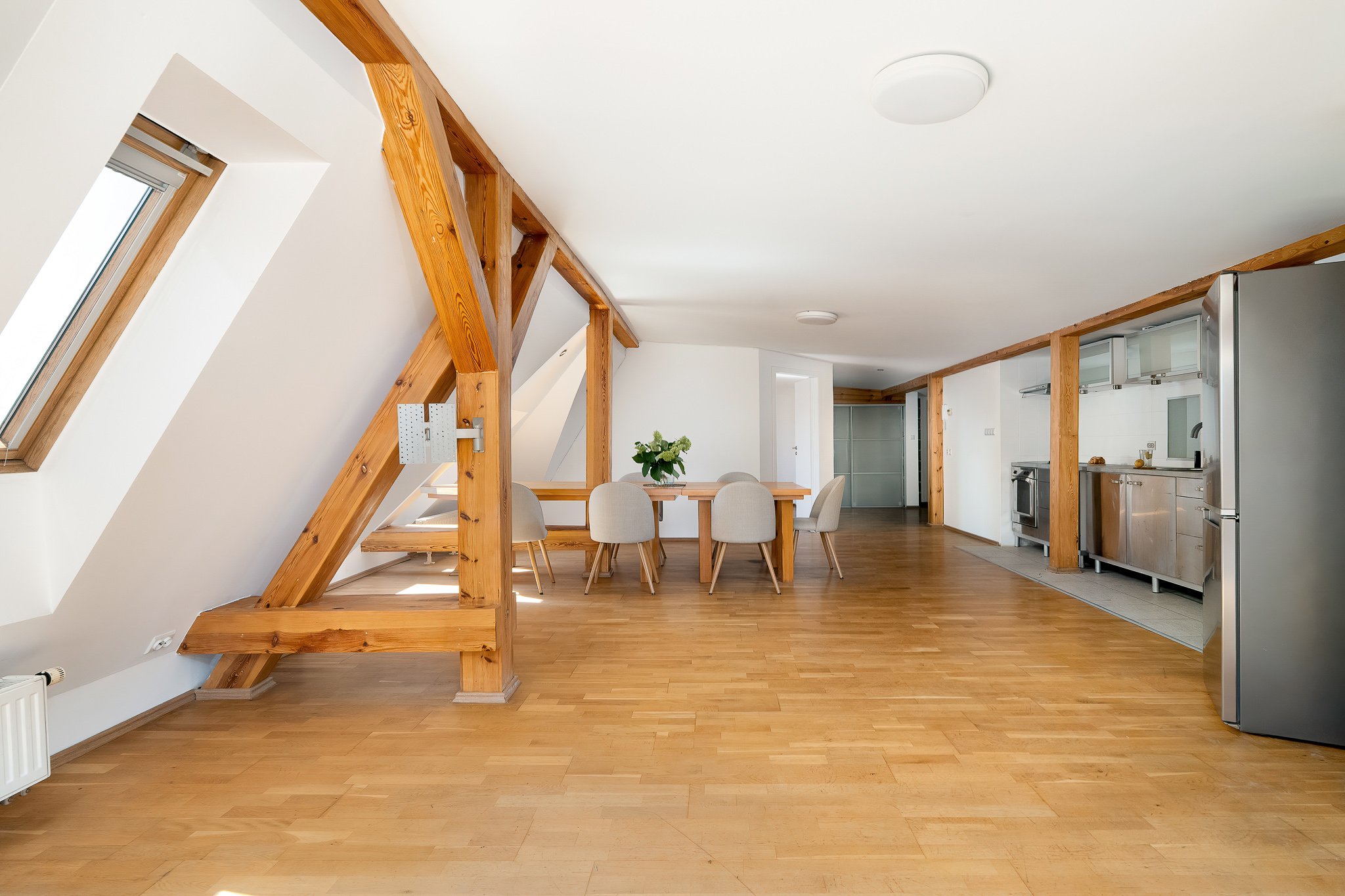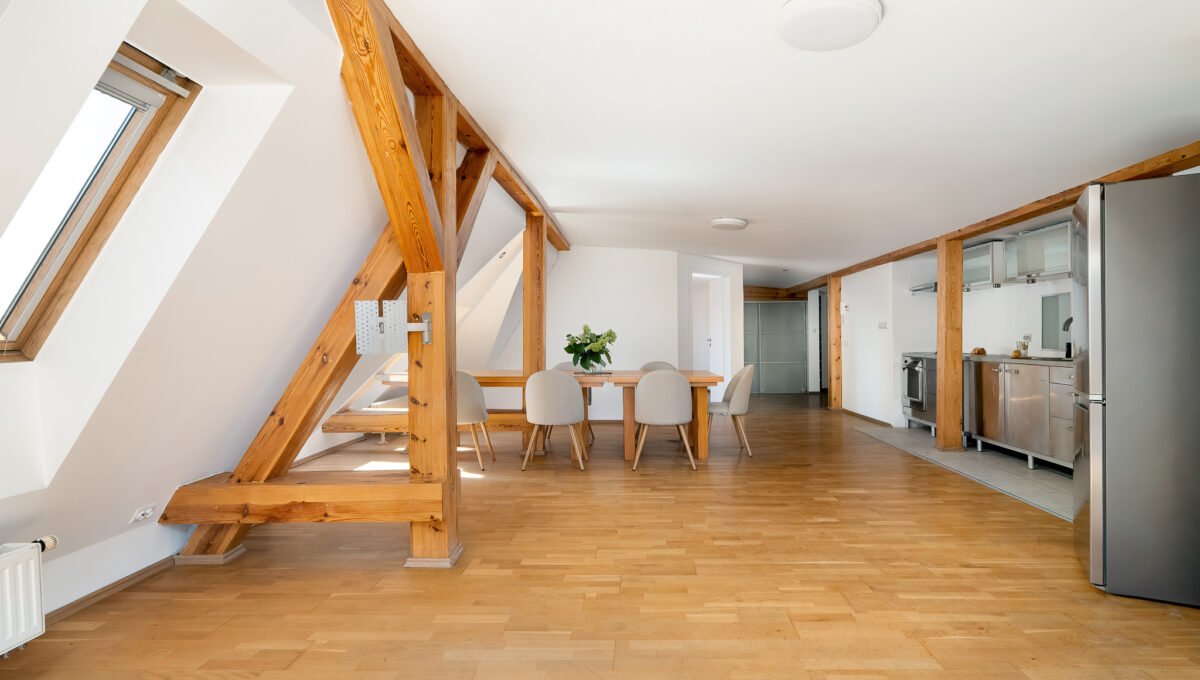 Przestronny salon z aneksem kuchennym tworzy otwarte, główne wnętrze mieszkania. Charakterystyczne skosy i widoczne, drewniane belki stropowe nadają przestrzeni przytulności i architektonicznego wyrazu. Centralne miejsce zajmuje duży, solidny stół z naturalnego drewna, który z powodzeniem pomieści rodzinne spotkania, kolacje z przyjaciółmi czy codzienne posiłki w większym gronie.