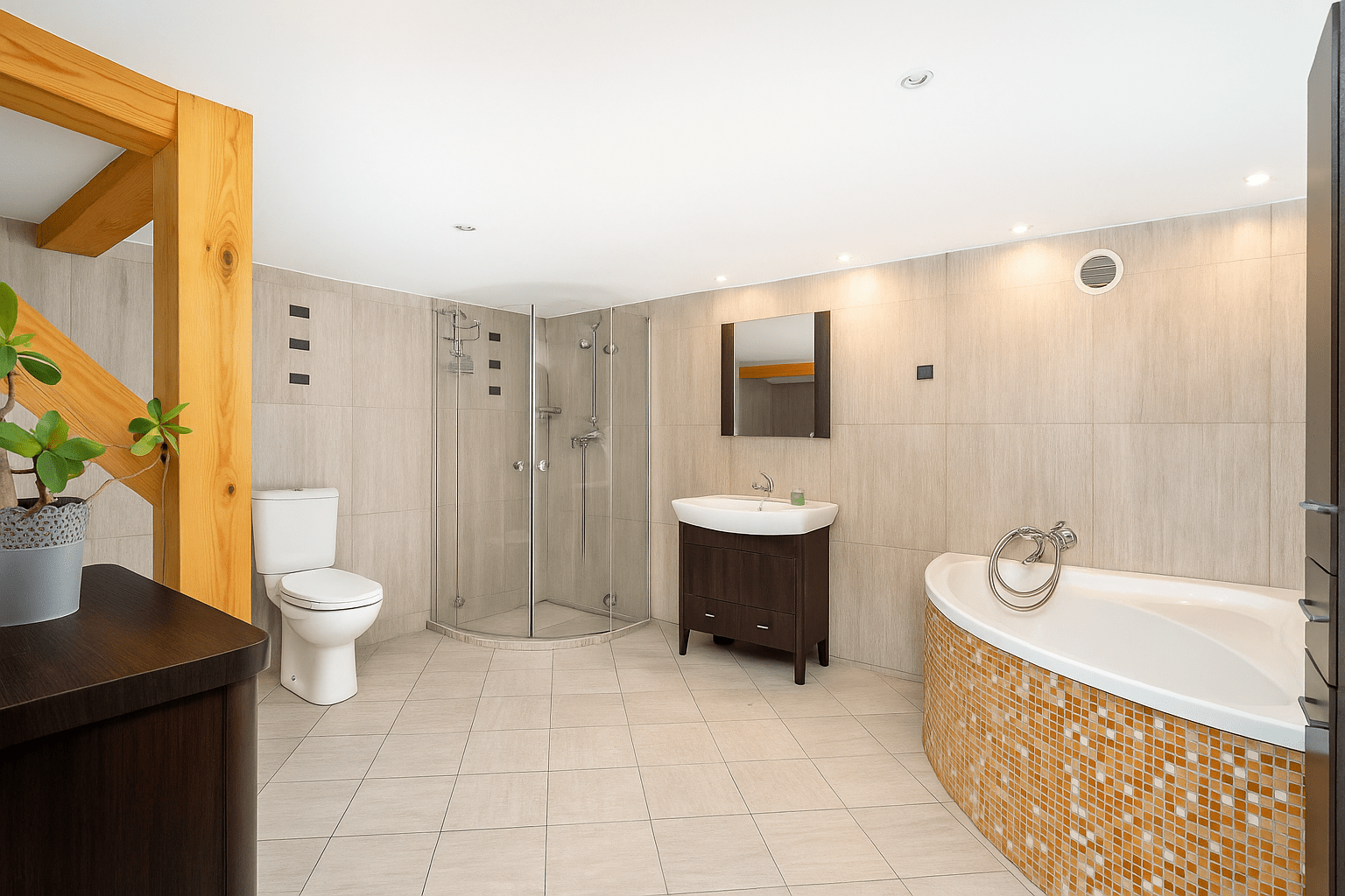 Łazienka została zaaranżowana z dbałością o funkcjonalność i estetykę – oferuje wszystko, czego potrzeba w codziennym użytkowaniu (m.in. prysznic oraz wanna), a jednocześnie wpisuje się w styl mieszkania.