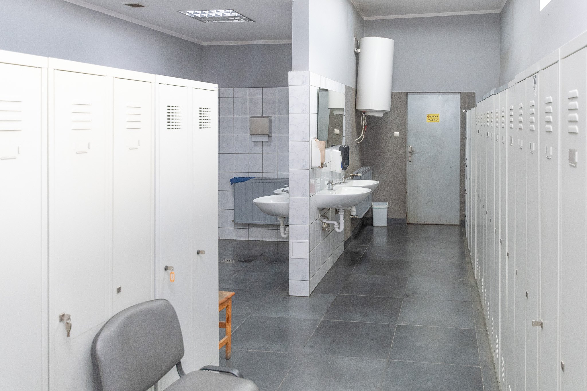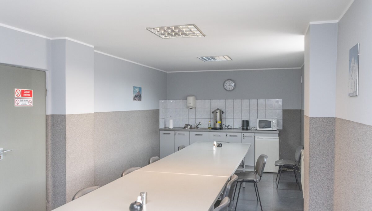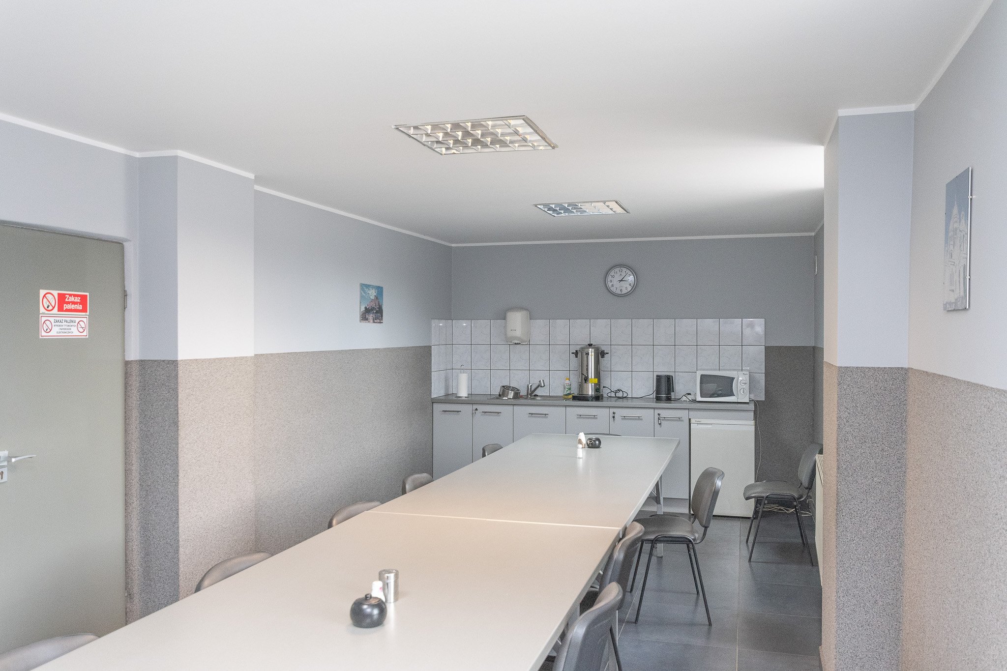 Strefa socjalna dostępna jest zarówno z głównego ciągu komunikacyjnego, jak i bezpośrednio z hali warsztatowej, co ułatwia korzystanie z niej pracownikom produkcyjnym. W jej skład wchodzą szatnia z pełnym zapleczem sanitarnym, wyposażonym w prysznice, toalety i umywalki, oraz przestronna jadalnia umożliwiająca wygodne spożywanie posiłków.