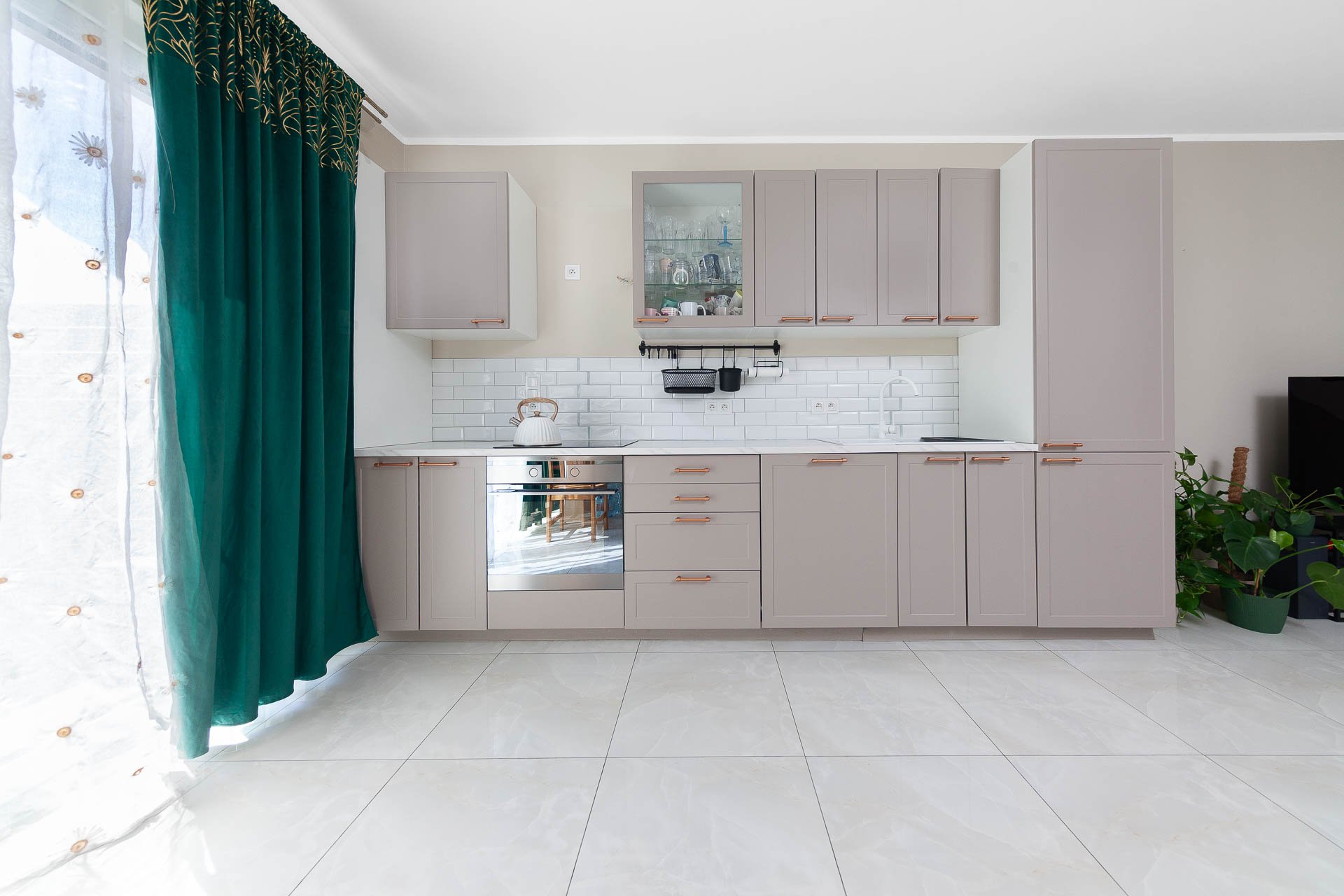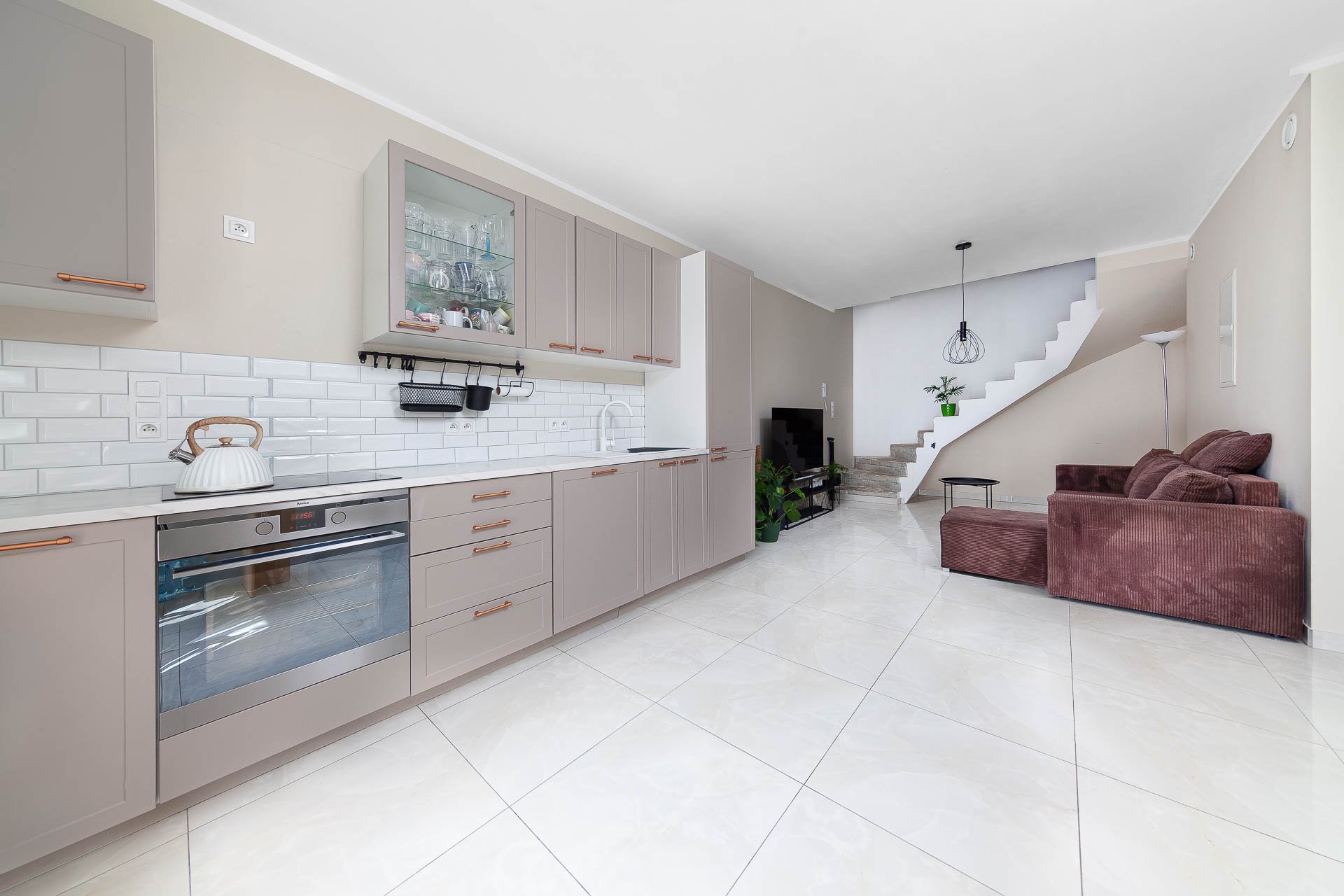 Na parterze znajduje się przestronny i jasny salon z kuchnią oraz wygodnym wyjściem na ogródek. To komfortowa przestrzeń do wspólnego spędzania czasu.