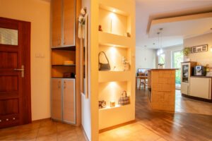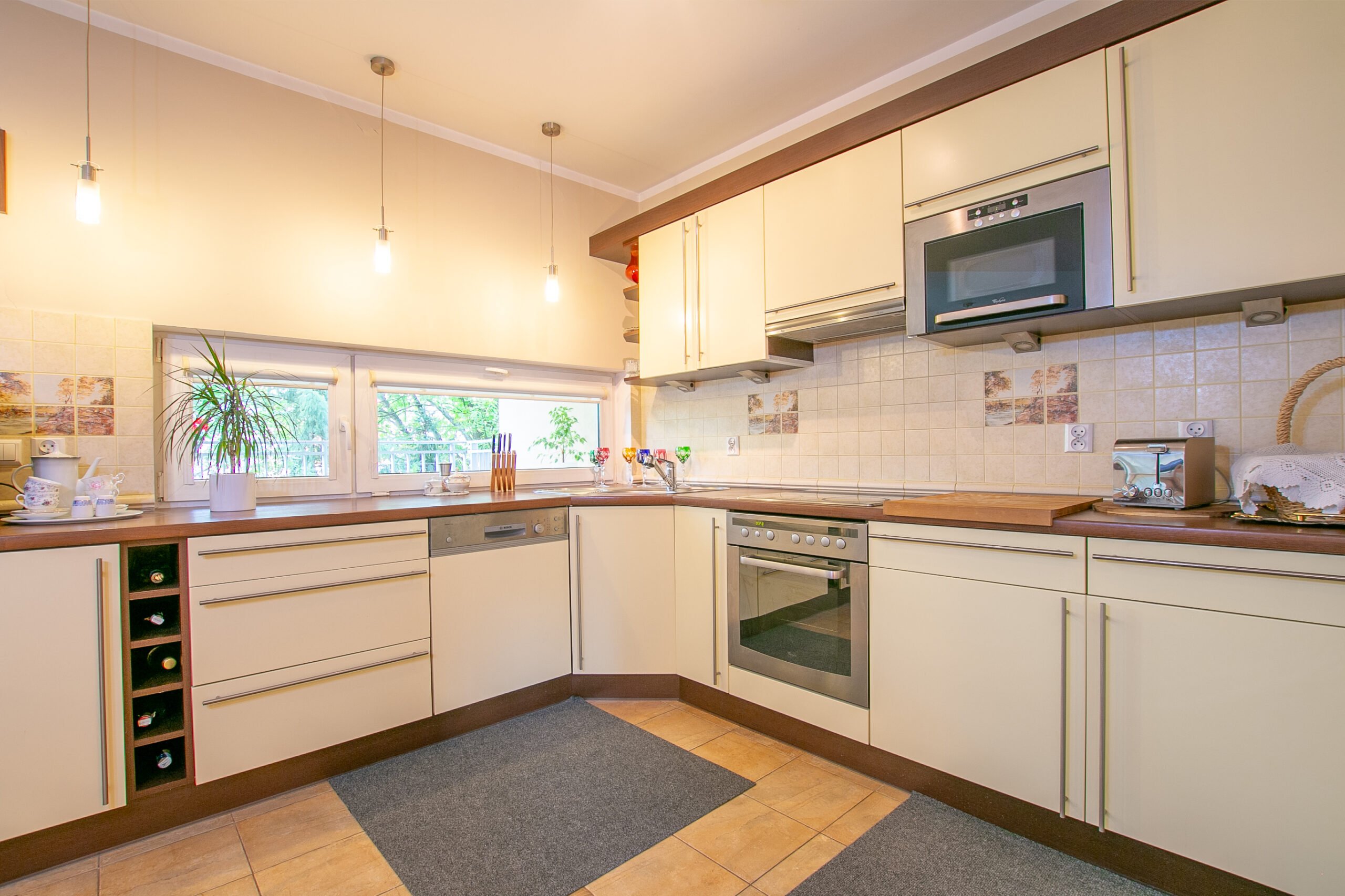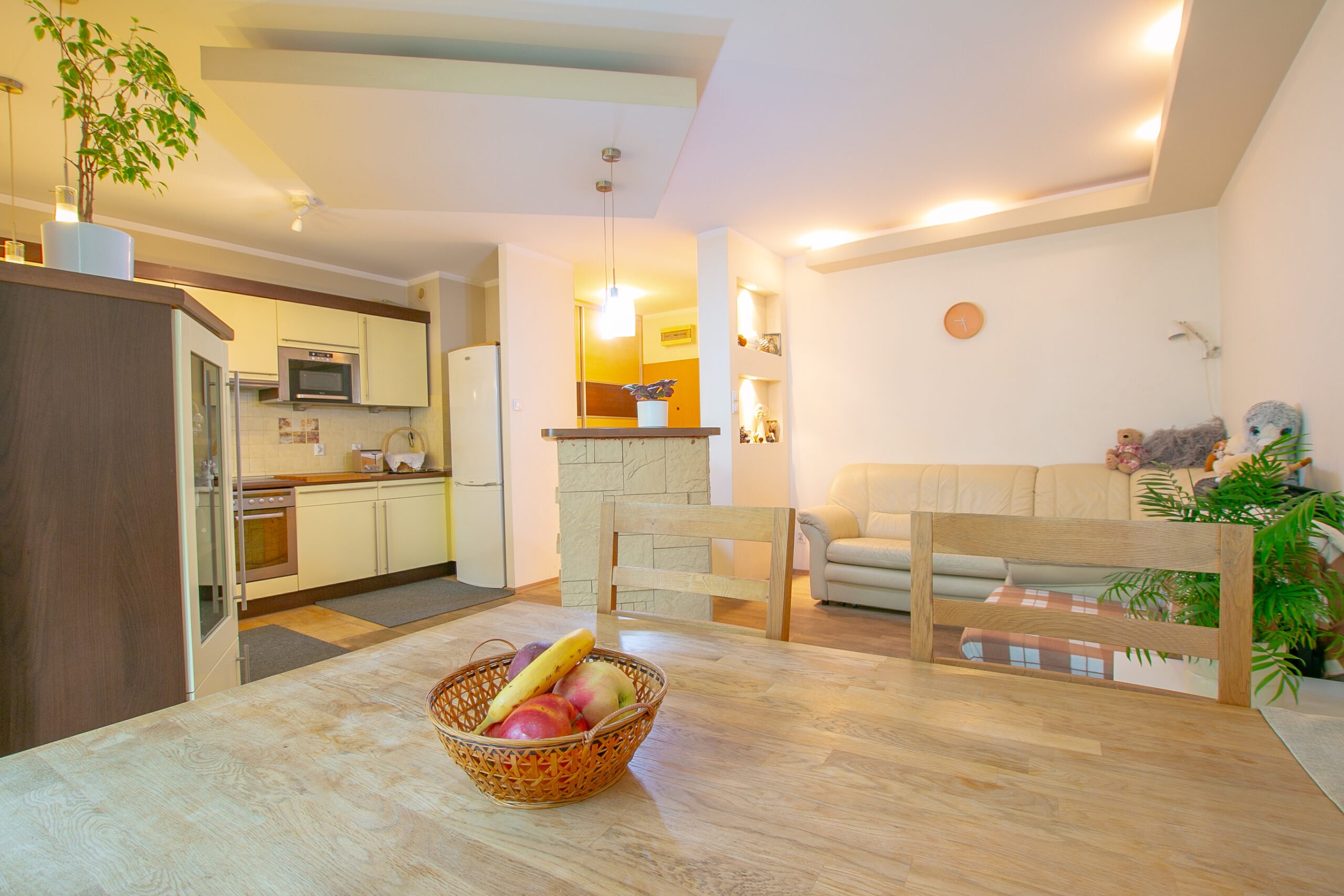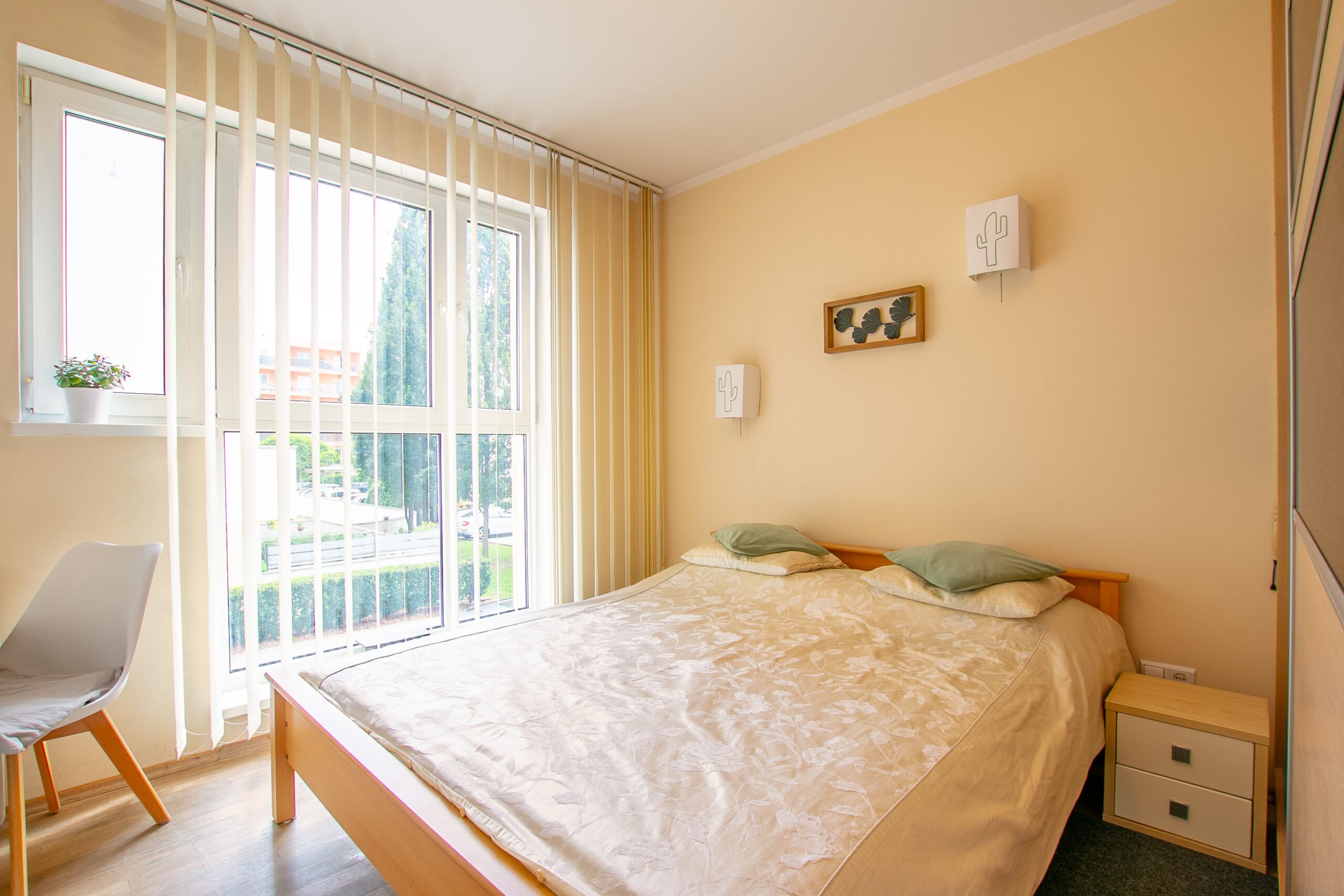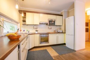 Na metraż lokalu składają się: przestronna kuchnia połączona z salonem oraz przedsionkiem, wygodna sypialnia oraz duża łazienka. Połączenie kuchni oraz salonu tworzy bardzo przestronny “open space“. Kuchnia wyposażona jest we wszystkie niezbędne sprzęty AGD: piekarnik, płytę indukcyjną, okap, zmywarkę, lodówkę z zamrażarką oraz mikrofalówkę. Ponadto duża przestrzeń robocza na blacie dla osób lubiących gotować. Zastosowane oświetlenie sprawia iż mieszkanie jest przytulne i ciepłe. W łazience znajduje się prysznic oraz wolnostojąca pralka. Z salonu jest możliwość wyjścia na przestronny, prywatny balkon z widokiem na drzewa, przez co czuje się prywatność. Ekspozycja okien na kierunek północnego wschodu oraz południowego zachodu sprawia, że mieszkanie jest niezwykle jasne, znakomicie doświetlone oraz występuje w nim odpowiednia cyrkulacja powietrza. W mieszkaniu położone są podłogi z parkietu dębowego (wymagają renowacji). Dla mieszkańców dostępna jest wózkarnia/rowerownia.