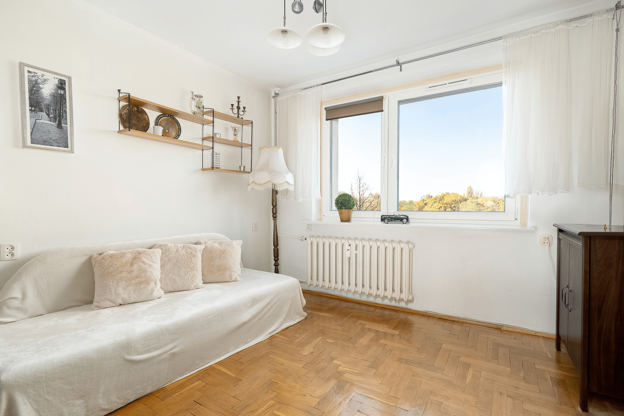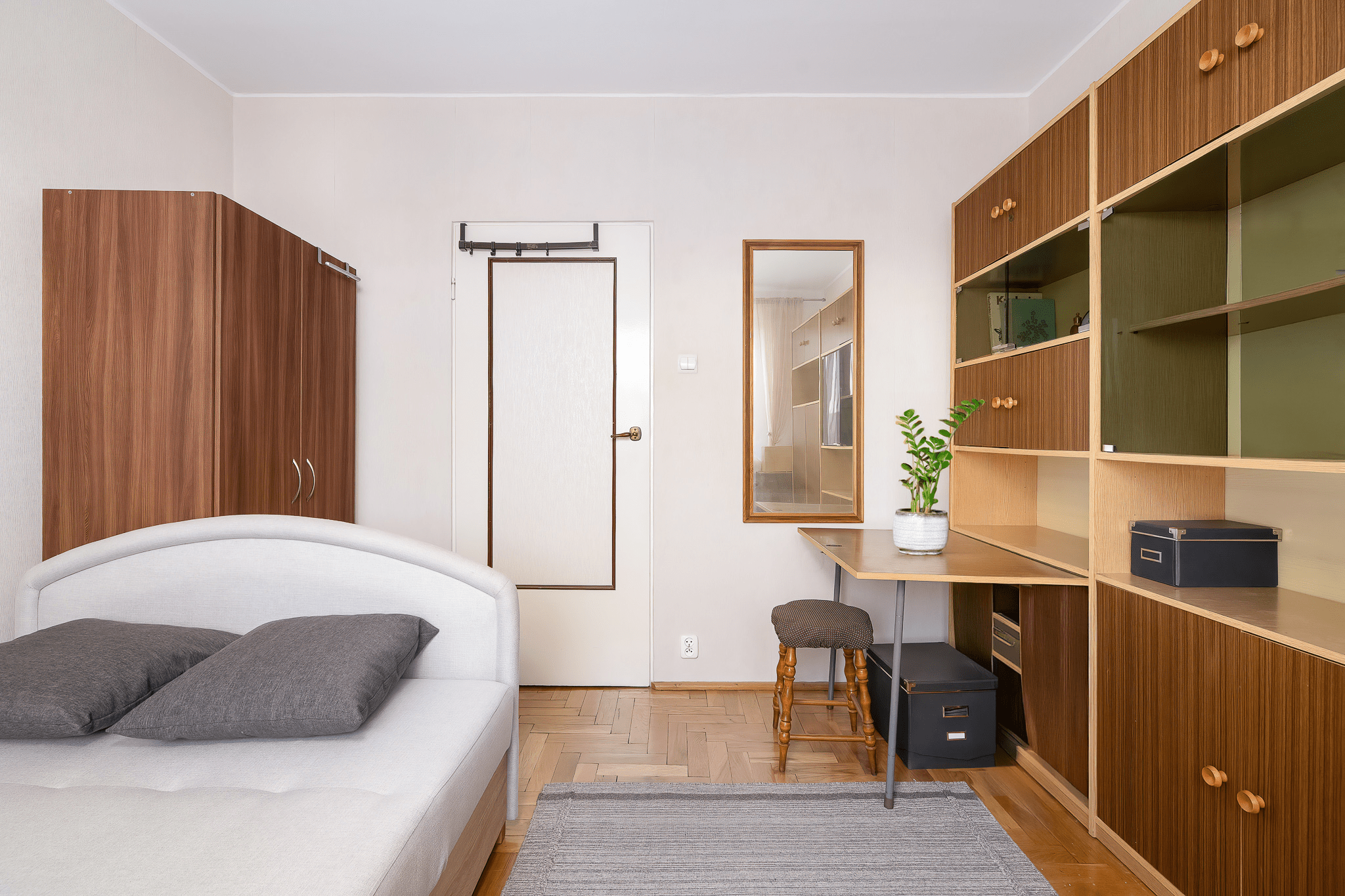 Mieszkanie jest jasne i ustawne, a naturalne światło dociera do wnętrza przez cały dzień. Salon z wyjściem na balkon stanowi idealne miejsce na strefę dzienną, umożliwiając jednocześnie wydzielenie części wypoczynkowej i jadalnianej.