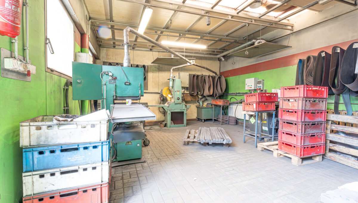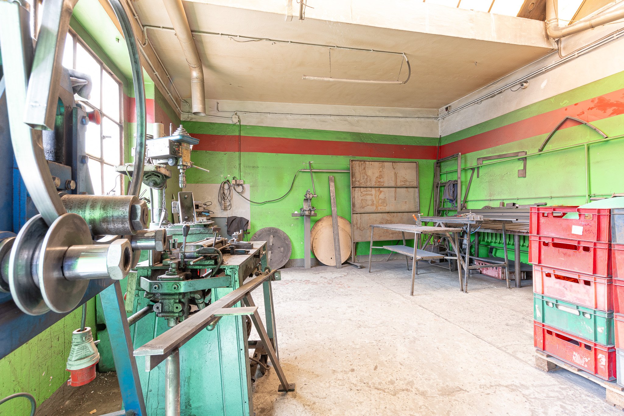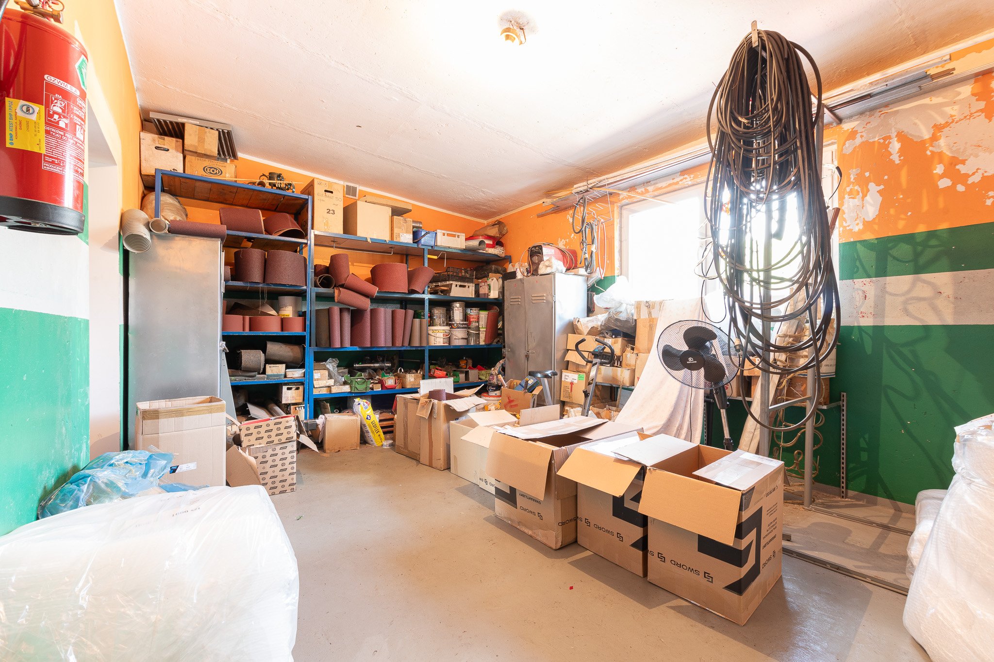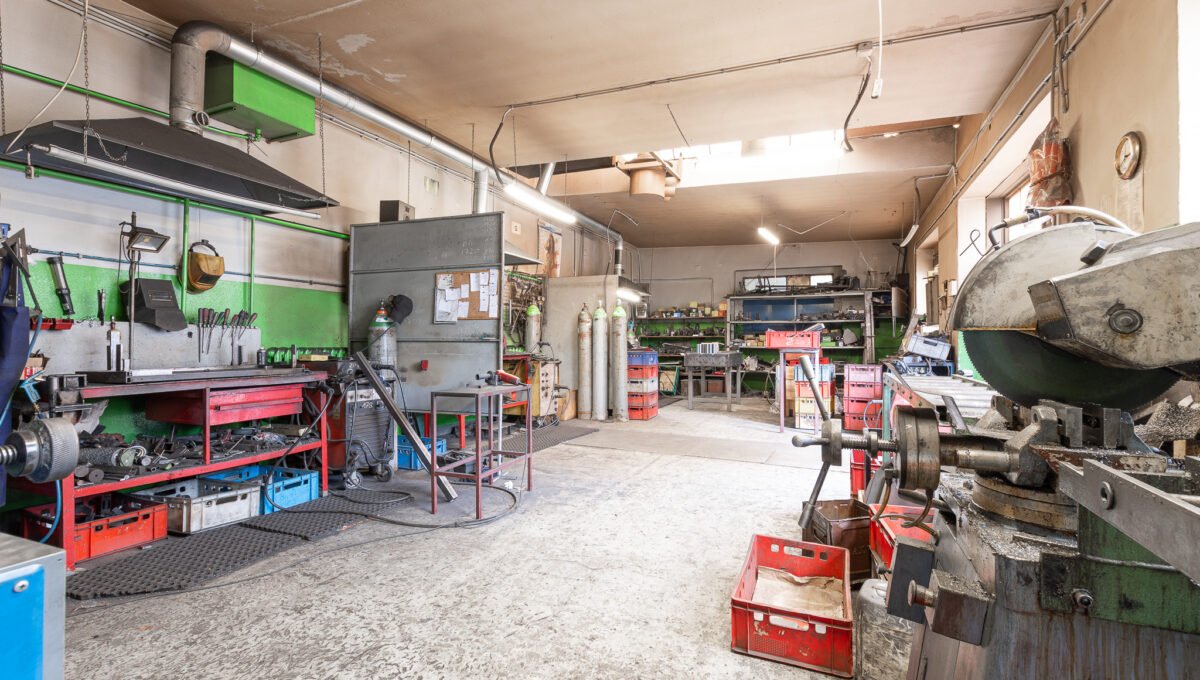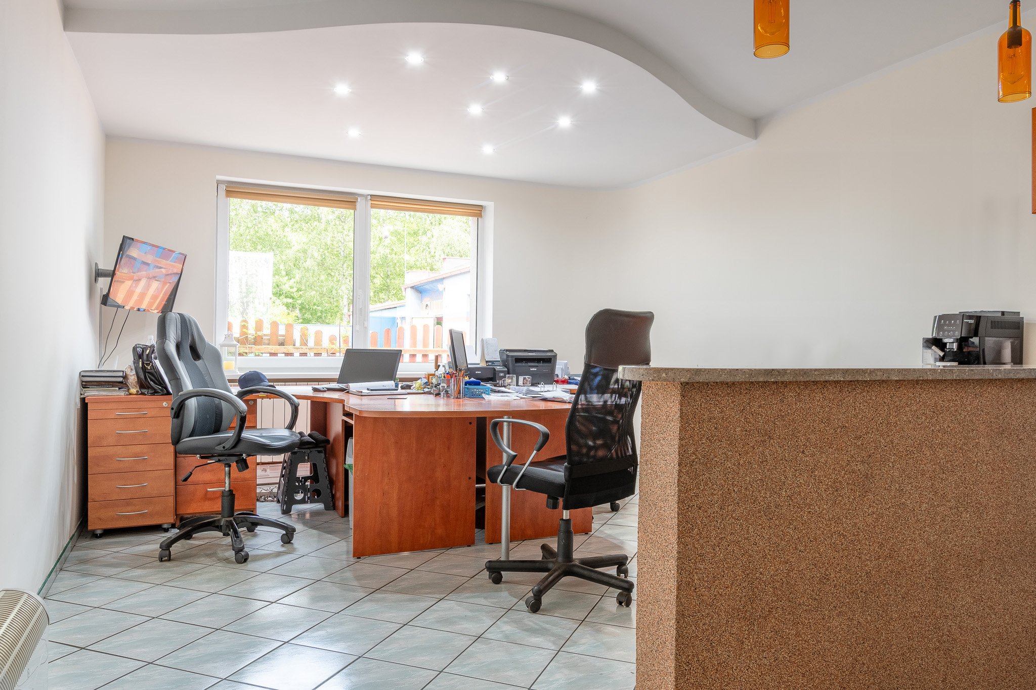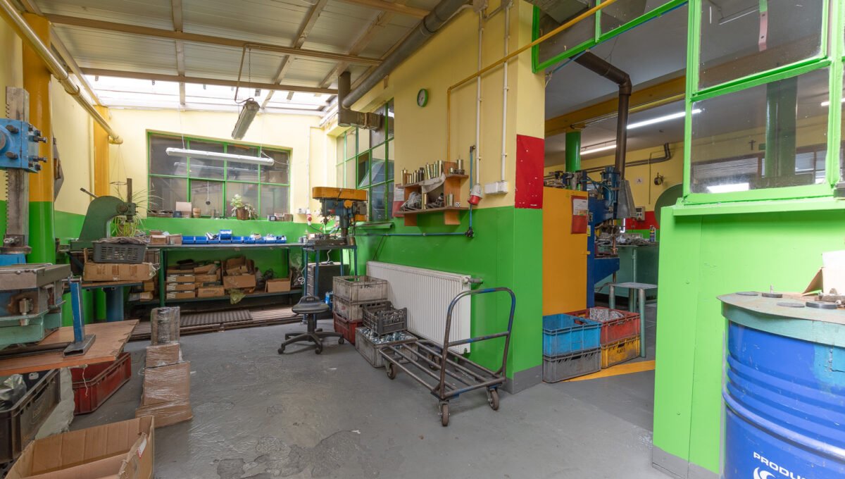 Trzykondygnacyjny budynek warsztatowy z zapleczem socjalnym, częścią biurowo-mieszkalną oraz piwnicą o powierzchni użytkowej 594,85 m2, wyróżnia się funkcjonalnym i dobrze przemyślanym układem pomieszczeń. Na parterze znajduje się przestrzeń biurowa, dostosowana do potrzeb administracyjnych i organizacyjnych oraz zaplecze socjalne; szatnia, jadalnia z aneksem kuchennym oraz łazienki. Również na parterze zlokalizowana jest hala warsztatowa oraz pomieszczenia warsztatowe. Piętro pełni funkcję mieszkalną – znajduje się tam kuchnia oraz pokoje, które mogą służyć jako pomieszczenia wypoczynkowe dla pracowników lub ich zakwaterowania. Taki podział zapewnia wygodne warunki zarówno do pracy, jak i codziennego użytkowania. Część mieszkalna budynku została wyposażona w klimatyzację. W budynku znajduje się również piwnica, która pełni funkcję pomieszczenia technicznego.