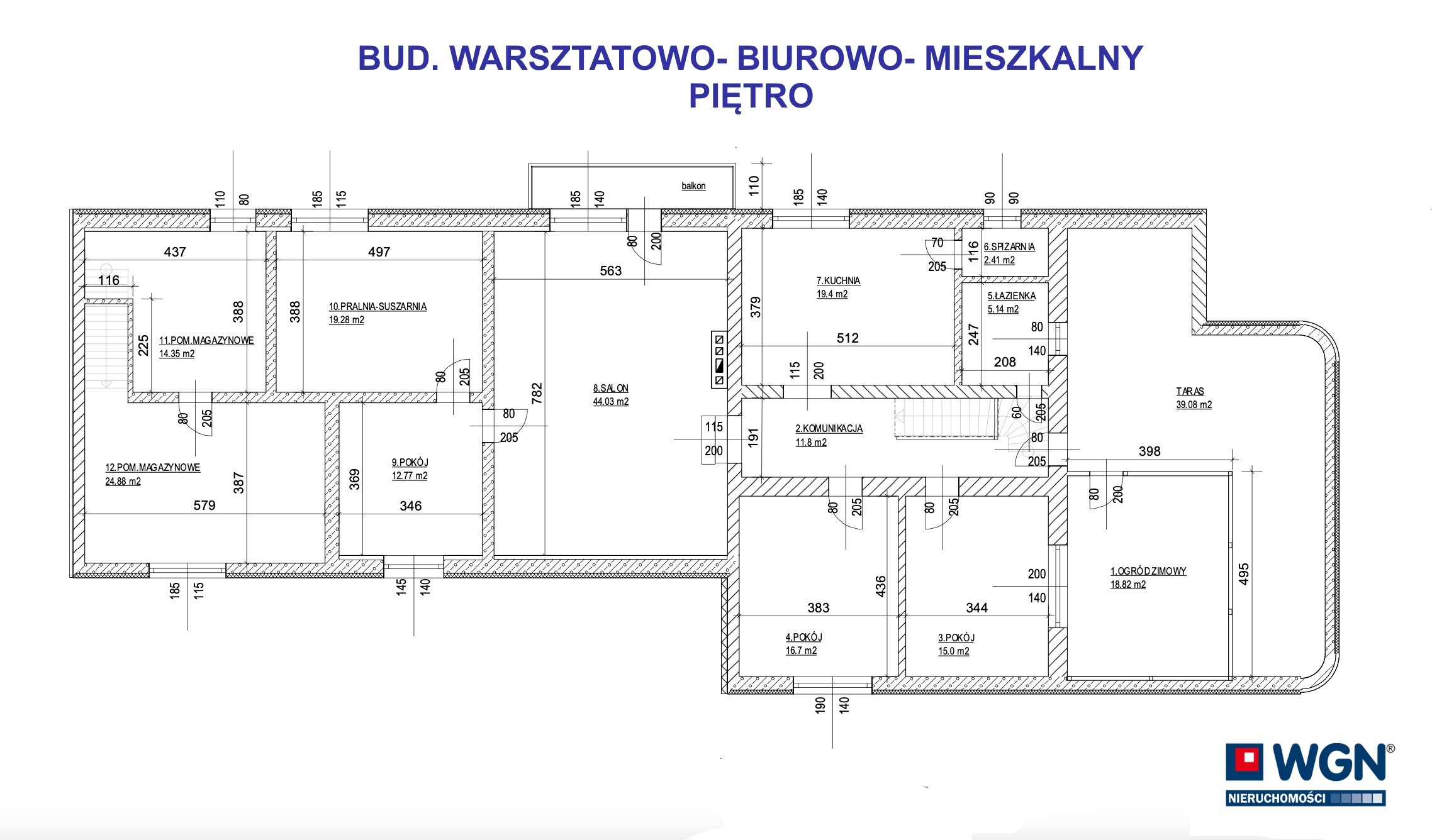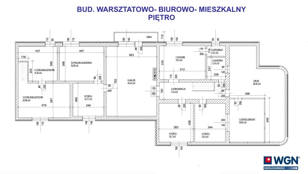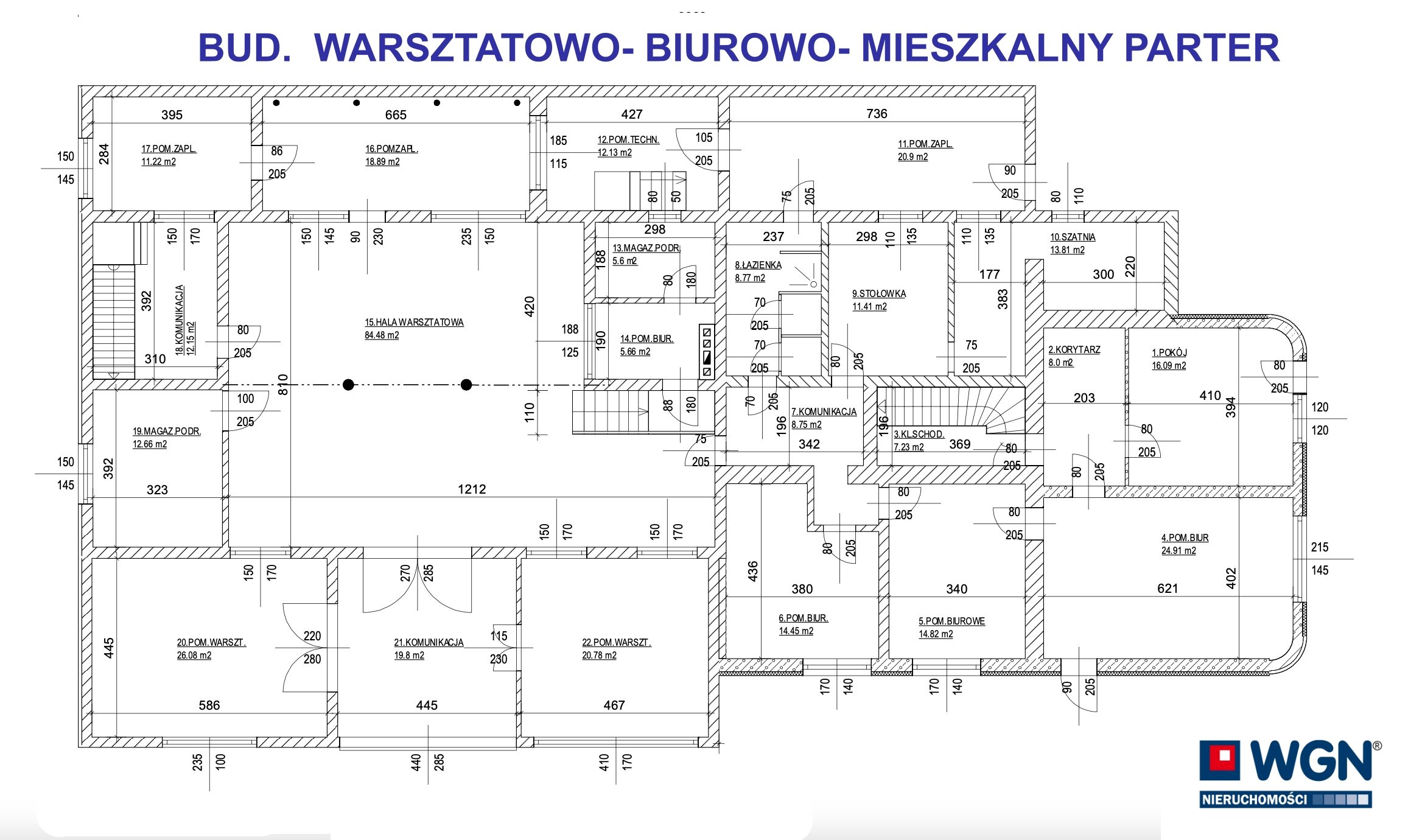 Powierzchnia użytkowa budynku warsztatowo – magazynowego z funkcją mieszkalną: 594,85 m2