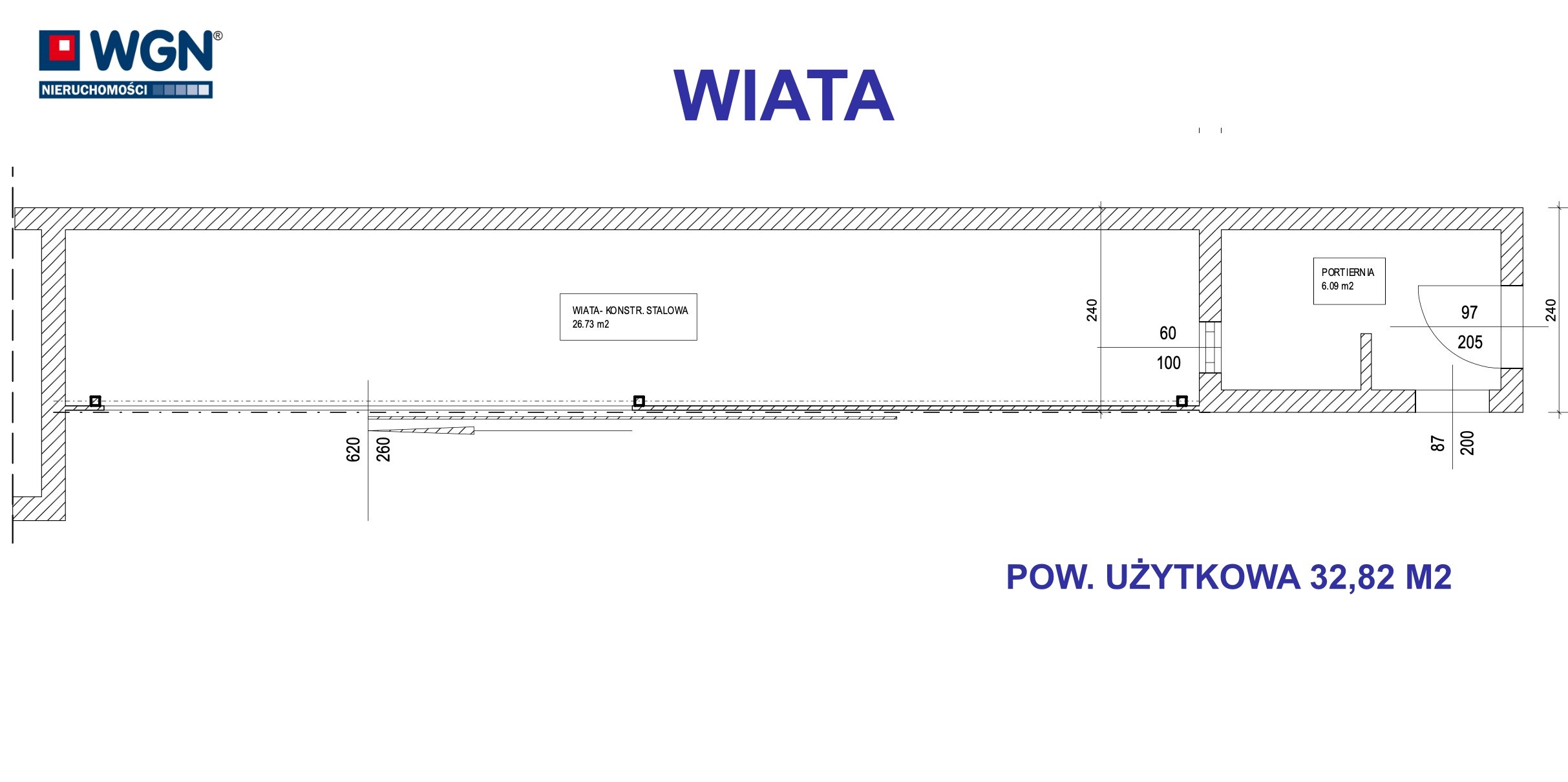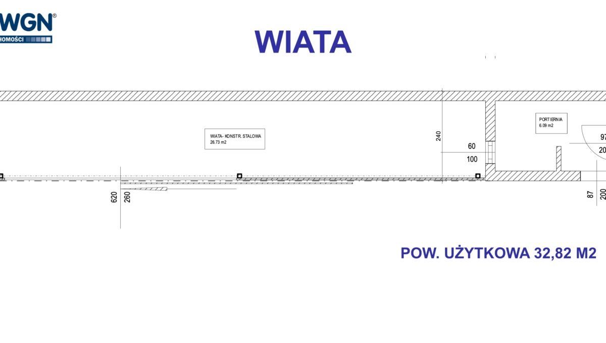 Na terenie nieruchomości znajduje się również wiata magazynowa o powierzchni 32,82 m2, zapewniająca dodatkową przestrzeń do przechowywania materiałów lub towarów.