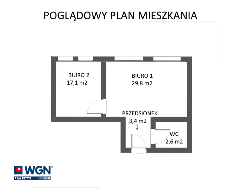Lokal o powierzchni 55,4 m² składa się z dwóch biur oraz WC:
